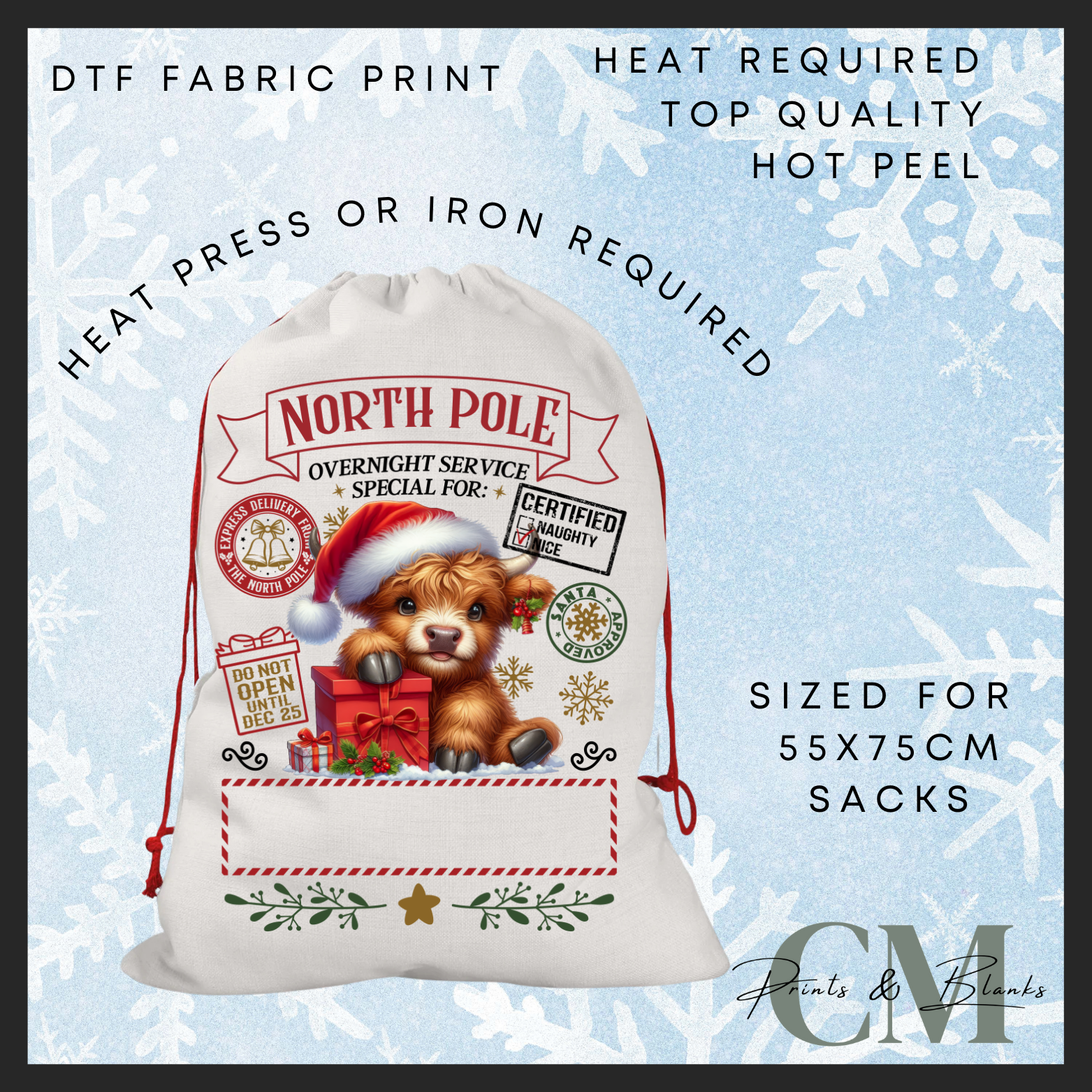 North Pole highland cow DTF Santa sack transfer