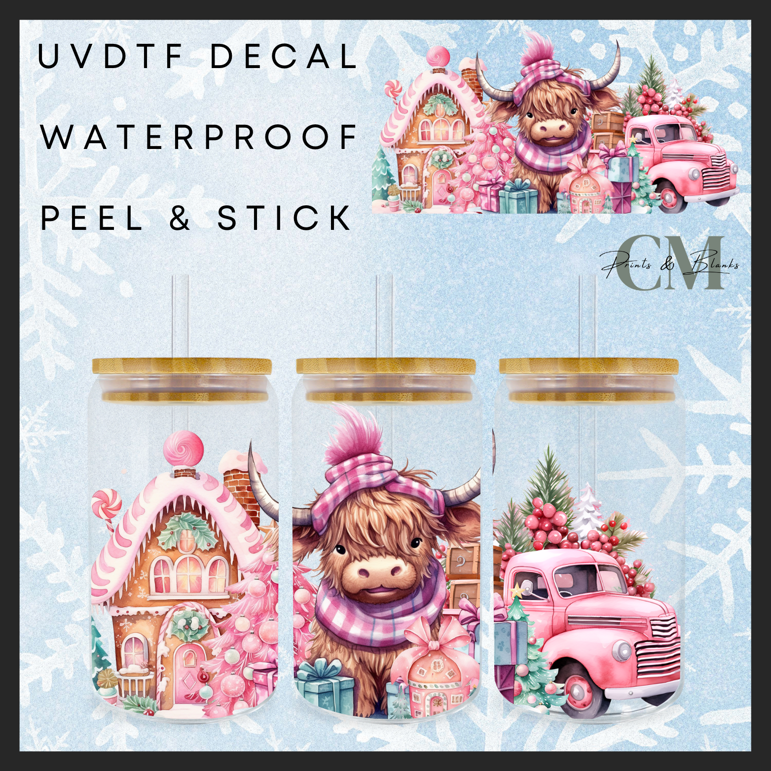Pink Christmas highland cow 16oz Uvdtf wrap